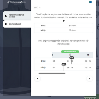 Om du önskar kontrollmäta kan du klicka dig in på ”storlekstabell” och jämföra om Fitles digitala mått av dig överensstämmer med dina faktiska kroppsmått. Om det avviker rekommenderar vi dig att justera dina inledande svar så att det bättre överensstämmer innan du bestämmer dig för korrekt storlek.
